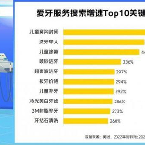 美团数据显示,在消费者线上购买的口腔齿科服务项目中,基础的口腔护理项目洗牙订单占半数以上,三年复合增长率达到78%。除洗牙外,儿童成为口腔健康消费的刚需人群,美团数据显示,“儿童窝沟封闭”“儿童涂氟”成搜索热度增长最快的热搜词,同比增速分别达到533%和443%。