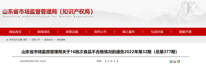 2022年9月19日,山东省市场监督管理局网站发布关于16批次食品不合格情况的通告2022年第32期(总第377期)。据通告,山东省市场监督管理局对保健食品、饼干、餐饮食品、炒货食品及坚果制品、蛋制品、淀粉及淀粉制品、调味品、豆制品、方便食品、糕点、罐头、酒类、粮食加工品、肉制品、乳制品、食用农产品、食用油、油脂及其制品、蔬菜制品、水产制品、速冻食品、特殊膳食食品和饮料共22大类食品1163批次样品进行了监督抽检,其中餐饮食品、炒货食品及坚果制品、糕点、肉制品、食用农产品、饮料6大类食品16批次样品不合格,检出了农兽药残留超标、食品添加剂超范围超限量使用、质量指标不达标、微生物污染、重金属污染、生物毒素。有关情况如下: