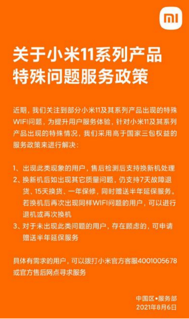 随着投诉的人越来越多,小米11系列手机的质量问题引发市场关注。2021年8月6日,小米官方发表相关声明,表示小米11系列产品若出现特殊情况可以申请更换新机,并且小米11用户都可以申请赠送半年延保服务。