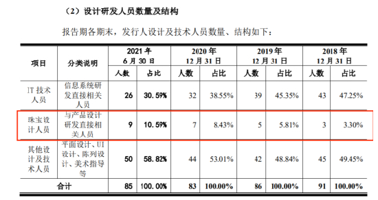 根据DR在2021年的招股书披露,公司主要从事珠宝首饰的研发设计、品牌运营和定制销售。但数据显示,2021年上半年,该公司的珠宝设计人员仅有9人,主要通过聘请外部设计团队研发、合作厂商选款等方式进行新品研发。2021年上半年,公司34个新增款式中,内部设计师设计的数量仅为2款,其余皆为合作厂商设计。