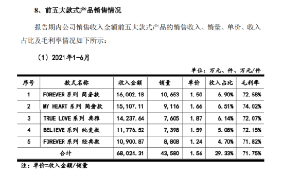 从具体产品的毛利率来看,2021年上半年,其销售收入排名第一的产品为FOREVER系列简奢款,成本仅为4000元左右,售价却高达1.5万元,毛利率超过72%。