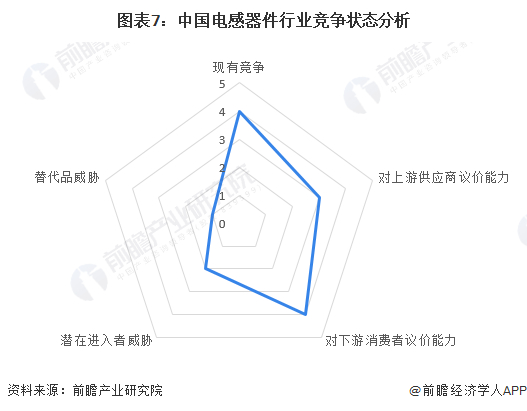 根据以上分析,对各方面的竞争情况进行量化,5代表最大,0代表最小,电感器件行业现有企业间的竞争较为激烈,由于我国电感器企业起步较晚,目前大部分市场被国外品牌所占据;由于电感器件下游应用领域广泛,从电感器产销情况来看,下游需求旺盛,需求量快速增长,总体来看电感器件行业对下游客户议价能力较强;电感器件上游原材料主要有银浆、铁氧体粉、铜杆等企业,议价能力受原材料价格波动所影响,整体来看电感器件行业对上游供应商的议价能力一般;电感作为三大被动元件之一,有其功能上的不可替代性,片式电感器凭借自身优势逐渐替代插装电感器,整体来看电感器件替代产品威胁较少;尽管电感器件应用领域广泛,市场吸引力较强,但由于技术、资金等因素设置了较高的进入壁垒,现有的企业集中度较高,综合来看潜在进入者威胁较小。
