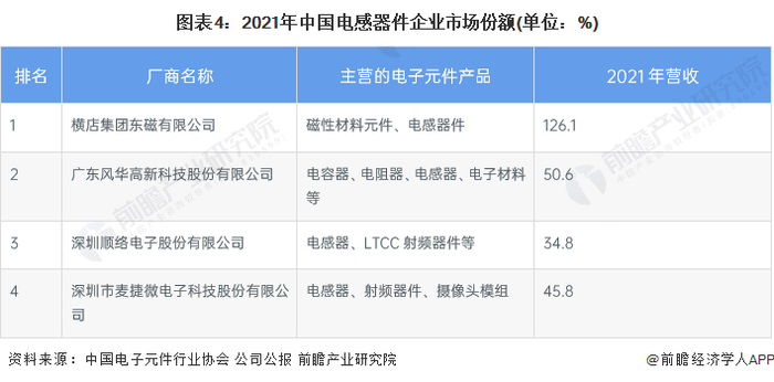 根据中国电子元件行业协会公布的电子元件百强企业中,有五家上榜的电感器企业。2021年中国电子元件百强企业中,横店集团东磁有限公司的规模最大,2021年营业收入达到126.1亿元。风华高科、顺络电子、麦捷科技均是电感器件行业排名靠前的企业,其年营业收入在30-50亿元的区间内。