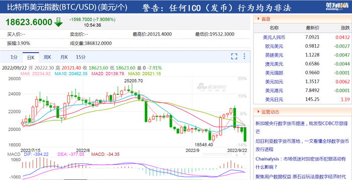 近一个多月时间,虚拟货币跌跌不休。9月22日,比特币再度跌破20000美元、19000美元两大关口。截至发稿,比特币暂报18578美元,大跌8.09%。