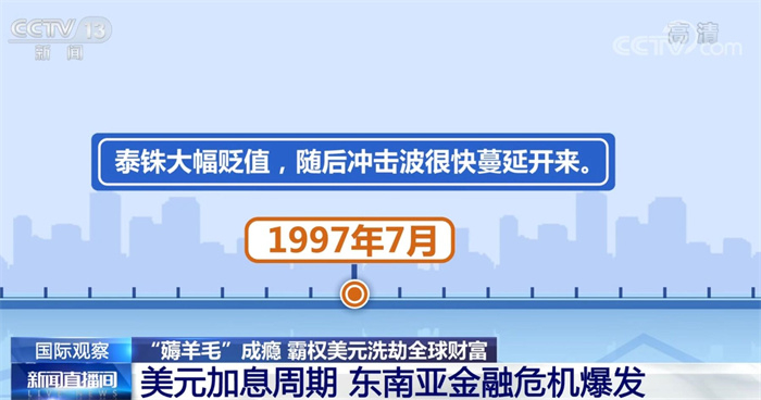 美国在自家“后花园”拉美地区成功“薅”了一波“羊毛”后,又将目光投向亚洲。上世纪90年代初,东南亚地区经济繁荣发展,在美联储操纵下,大量融资流入东南亚,多国出现经济过热的现象。随后在1994到1995年间,美联储在13个月的时间里接连七次加息。强势美元使大量资本回流美国,成为触发1997到1998年东南亚金融危机的一个关键因素。1997年7月泰铢大幅贬值,随后冲击波很快蔓延开来,东南亚国家付出了惨痛的代价才从此次动荡中恢复过来。