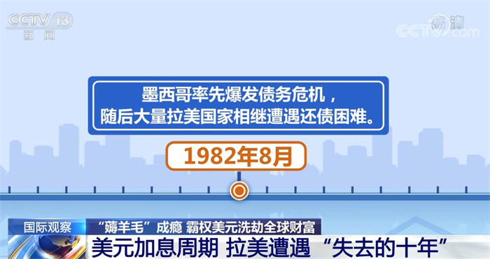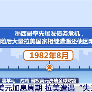 上世纪70年代,美联储实行低利率政策刺激投资与就业,让美元贬值。一些拉美国家趁机借入大量低利息的美元,投资石油开发,拉美国家外债规模不断膨胀。70年代末至80年代初,美联储突然开启加息周期,美元升值,石油价格下跌,那些借美元开采石油的拉美国家一下子掉进了“美元的陷阱”。1982年8月,墨西哥率先爆发债务危机,随后大量拉美国家相继遭遇还债困难,80年代也因此被称作拉美地区“失去的十年”。