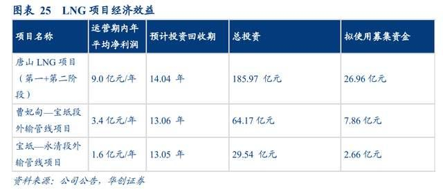 由项目可行性报告分析可知,唐山LNG项目年平均净利润可达9.0亿元,投资回收期为14年。外输管线项目方面,曹妃甸―宝坻段外输管线项目年均净利润为3.4亿元、宝坻―永清段外输管线项目年均净利润达1.6亿元,投资回收期均为13年。预计上述项目投产后可显著带动公司天然气业务的业绩增长。