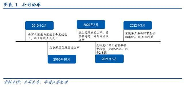 公司成立于2010年,由河北建投与建投水务发起设立,同年10月于香港联交所成功上市。公司立足于河北并向全国逐步发散,从事新能源和清洁能源的开发与利用。公司主要涉及风电运营、光伏运营和天然气批发与零售三部分。2020年6月新天绿能登陆A股,于上交所成功上市。截至2021年底,公司风电装机达5674MW,拥有7条天然气长输管道和31个城市燃气项目。