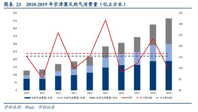 从增长中枢来看,京津冀天然气消耗5年CAGR为16.7%,较9年CAGR15.5%增速有所上移,反映出京津冀地区天然气消费需求随时间推进呈现出不断增长的趋势。