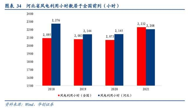 进一步,从利用小时看,河北整体利用小时水平优于全国。2018年-2020年,河北省风电利用小时数为2276/2144/2145小时,分别优于全国181/61/72个小时。2021年河北风电利用小时数有所回落,但仍和全国水平基本持平。