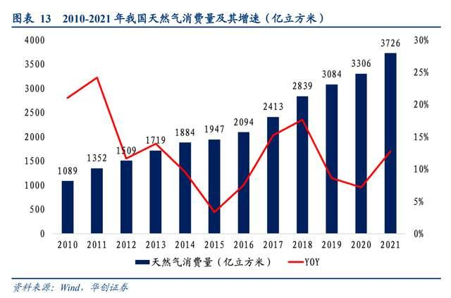 2021 年,全国天然气表观消费量 3,726 亿立方米,同比增长 12.7%。十四五期间,对天然气的需求将不断提高。《中国天然气发展报告》中指出,通过合理引导和市场建设,我国2025 年天然气消费规模将达4300亿-4500亿立方米,2030年达到5500 -6000亿立方米,后续对于天然气的需求仍将延续。