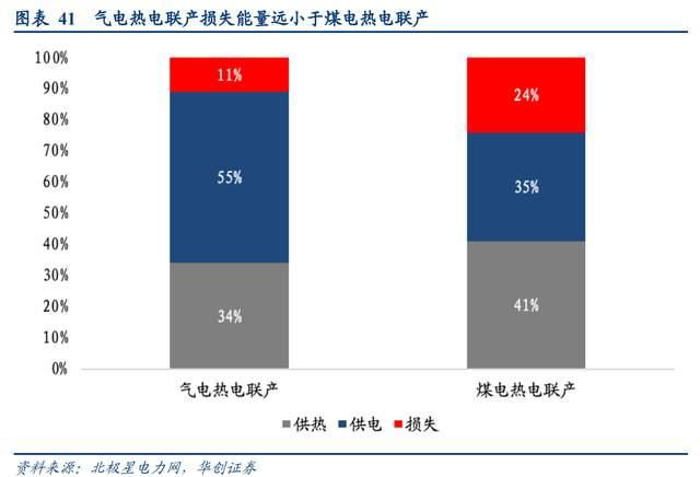 由于天然气产生的热能更为高效和优质,能效转化优势更高。以9HA660MW超超临界机组与660MW超超临界煤电机组进行比较。气电燃机联合循环热电联产的效能高于传统的火电机组,在燃烧同等热值的情况下,气电机组损失11%的热量,远低于常规煤电机组24%的热量损失。