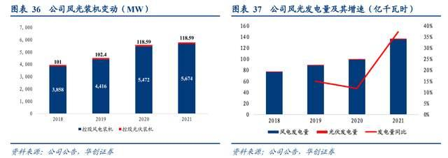 截止2021年底,公司风电装机5674MW、光伏装机119MW,装机容量较2018年增长46.3%。装机容量提升带动发电量增长,2021年公司发电量达137亿千瓦时,较上年增长36.66%,较2018年发电量增长75.8%。