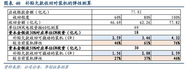 参照我们的核心假设:1)单位GW风电投资按60亿元,2)补贴收回程度假设在60%-100%;3)风电项目的资本金比例为30%(考虑到运营商有可能将资金本比例提高,对50%资本金也进行测算)。