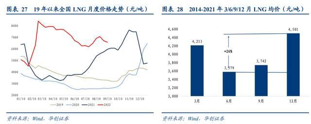 从全国LNG价格看,2019年以来基本均呈现出LNG价格每逢冬季便会迎来明显的跃升的特征,冬季价格高于夏季价格。拉长时间范围来看,2014年-2021年3、6、9、12月份的LNG平均价格分别为4213/3579/3742/4501元/吨,12月份价格较6月份价格高出26%。
