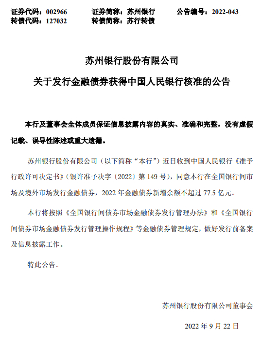 9月22日消息,苏州银行公告,公司近日收到中国人民银行《准予行政许可决定书》(银许准予决字〔2022〕第149号),同意该行在全国银行间市场及境外市场发行金融债券,2022年金融债券新增余额不超过77.5亿元。