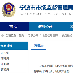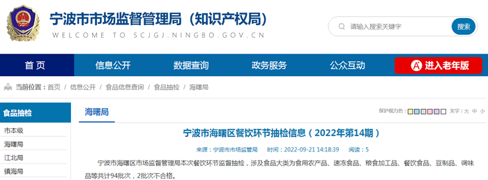 宁波市海曙区市场监督管理局本次餐饮环节监督抽检,涉及食品大类为食用农产品、速冻食品、粮食加工品、餐饮食品、豆制品、调味品等共计94批次,2批次不合格。