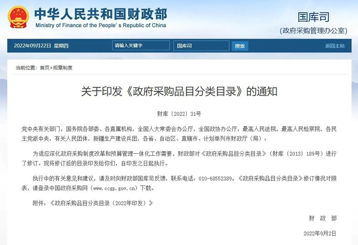本报讯 记者乐佳超报道 财政部日前发布《政府采购品目分类目录(2022年印发)》(以下简称《品目目录》)。此次修订后的《品目目录》体系更加完整,与国家相关标准和行业规范衔接更加紧密,也更适应现行改革发展要求。