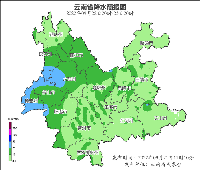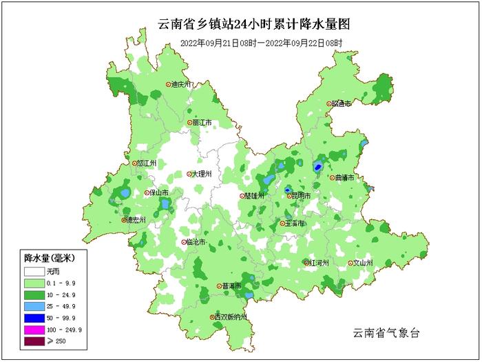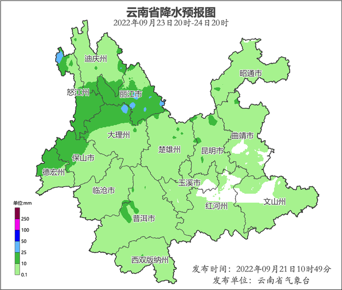 9月22日20时到9月23日20时:楚雄、丽江、迪庆南部、怒江南部、大理、保山、德宏、临沧西部、普洱西部阴有中雨局部大雨,其他地区阴天间多云小雨局部中雨。