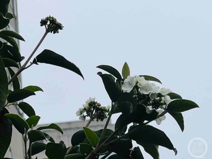在江北区海尔路,木本绣球和美人梅也花开二度。木本绣球此次开花的花量虽不及春天时多,但花色却更加雪白,犹如一朵朵“雪球”挂上枝头。