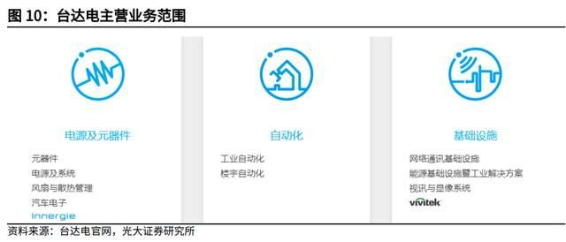 台达集团已逐步从关键零组件制造商迈入整体节能解决方案提供者,深耕“电源及零组件”、“自动化”与“基础设施”三大业务范畴,电源及零组件包括零组件、电源及系统、风扇与散热管理、汽车电子与 Innergie 消费性个人产品等;自动化包括工业自动化、楼宇自动化等;基础设施包括网络通讯基础设施、能源基础设施暨工业解决方案、视讯解决方案与 Vivitek、DP 等投影业务,2021 年三大业务的营收占比分别为 59%、15%、26%。