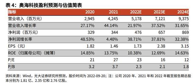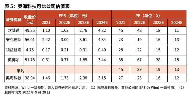2022-2024年可比公司平均 PE 为 39/19/13X,奥海科技2022-2024年 PE 为 23/16/12X,公司 PE 低于行业平均 PE。