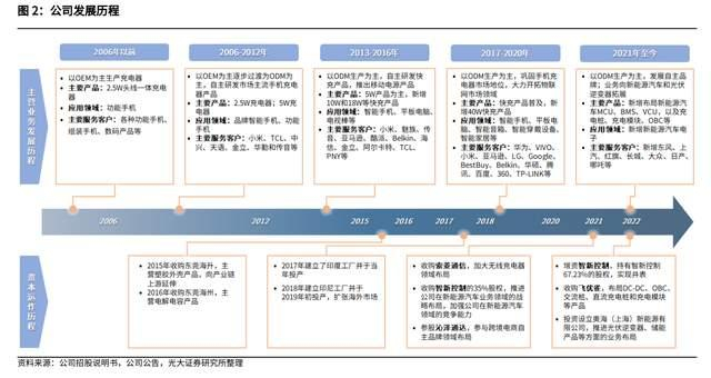 公司以手机充电器起家,不断深耕快充充电器的同时,横向拓展至 PC、IoT 智能终端、动力工具、数据电源等领域,并通过外延并购和供应链协同切入新能源汽车电子和光伏逆电器业务。