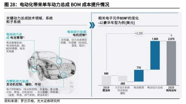 根据罗兰贝格,由于新能源汽车与电池管理和电驱系统相关的电子元器件用量大幅提升,相比燃油车 640 美元的 BOM 成本,2025 年纯电动车 BOM 成本预计为 2875 美元,单车净价值提升为 2235 美元。NE 时代数据显示,2022 年 7 月新能源乘用车电机电控搭载量达 47.9 万套,同比增长 98.6%;1-7 月累计搭载量达 280 万套,同比大幅增长 100%。
