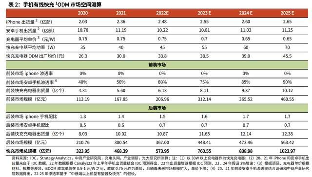 在前装大功率化+后装需求提升趋势下,预计手机快充 ODM 代工市场 2025 年将超千亿元。