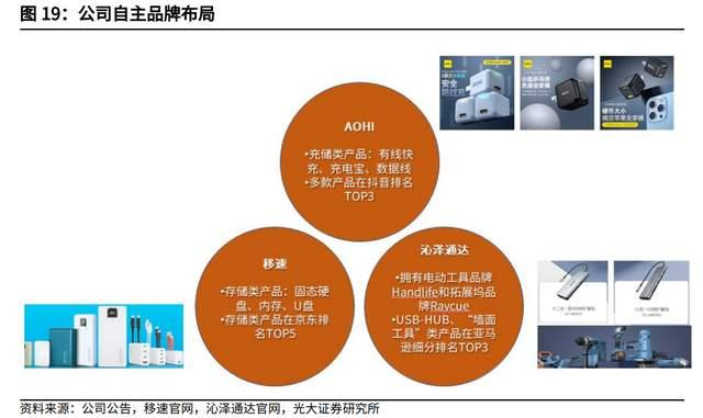 公司于 2020 年对组织结构进行 To B 和 To C 分化,目前已有“AOHI”和“移速”品牌,并持有跨境电商沁泽通达 49%股权。2021 年,公司自主品牌销售收入突破 4,000 万元;AOHI 品牌达成了天猫主动搜索充电器品牌 TOP10 的目标;移速品牌也取得了充电器天猫 TOP5、双十一 TOP3、存储类产品稳定前十的好成绩。