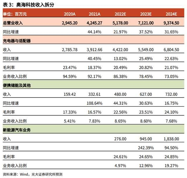 综上,预计该业务板块 22-24 年增速分别为 13.02%、25.49%、22.63%;考虑到手机大功率快充占比的持续提升,以及产品结构的持续优化(手机占比下降,IOT、动力工具等产品占比提升),预计毛利率将小幅提升,22-24 年毛利率分别为 20.49%、20.82%、21.07%。