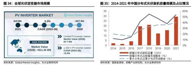 全球光伏逆变器市场规模 28 年接近 2000 亿人民币,新增光伏装机+存量替代双重驱动。据 Global Market Insights 数据,2021 年全球光伏逆变器市场规模达到 191.8 亿美元,预计 2028 年将超过 270 亿美元,22-28 年 CAGR 达到 5.3%。