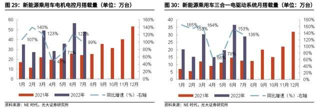 NE 时代数据显示,2022 年 7 月新能源乘用车多合一电驱动系统载量达 28.8 万套,同比增长 136%,占到总配套量的 60.1%;1-7 月累计搭载量达 165.6 万套,同比增长 131%。