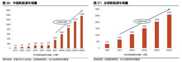 新能源汽车市场将维持高速增长。根据中国汽车工业协会的统计数据,新能源汽车销量在 2021 年增长至 352 万辆;根据亿欧智库预测,2025 年中国新能源汽车销售量将超 1300 万辆,21-25 年的年均复合增长率为 40%;2021 年全球新能源车销量为 650 万辆,亿欧智库预测 2025 年全球新能源车销量将达 2580 万辆,21-25 年的年均复合增长率为 41%。