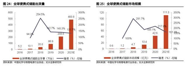 根据中国化学与物理电源行业协会的数据,便携式储能行业总市场规模 2021 年为 111.3 亿元,预计到 2026 年全球出货量将超 3000 万台,总金额将达 882.3 亿元人民币,21-26 年复合增速达到 51.3%。