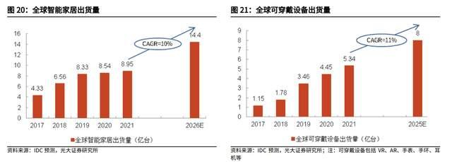 根据 IDC 数据,2021 年全球智能家居出货量为 8.95 亿台,到 2026 年将达到 14.4 亿台,21-26 年 CAGR 为 10%;2021 年全球可穿戴设备出货量为 5.34 亿台,到 2025 年将达到 8 亿台,21-25 年 CAGR 为 11%。