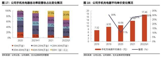 2021年公司手机充电器产品功率从以 10-20W 为主过渡到以 20-40W 为主,且 60W 以上产品占比也不断提升;2022 年一季度,30W 以上产品占比超过 50%,60W 以上产品占比达 28.4%,预计未来随着下游手机品牌商大功率充电器逐渐成为主流,大功率快充会成为公司主流产品;与之对应的,公司手机充电器 ASP 逐年提升,22 年达到约 17.48 元,较 20 年增长 65.5%。