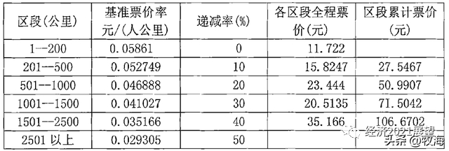 而随着里程数的增加,单人平均的票价率也不断降低,例如:对于普速非空调硬座,501~100km区段,基准票价率为0.046888元/(人公里),2500km以上仅为0.029305元/(人公里)。