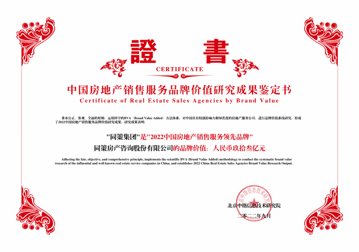 2022年9月15日,“2022中国房地产品牌价值研究成果发布会暨第十九届中国房地产品牌发展高峰论坛”在北京举行。大会发布了2022中国房地产及服务优秀品牌企业榜单,凭借着过往表现,同策集团(以下简称“同策”)荣获“2022中国房地产销售服务领先品牌”,品牌价值达93亿元。