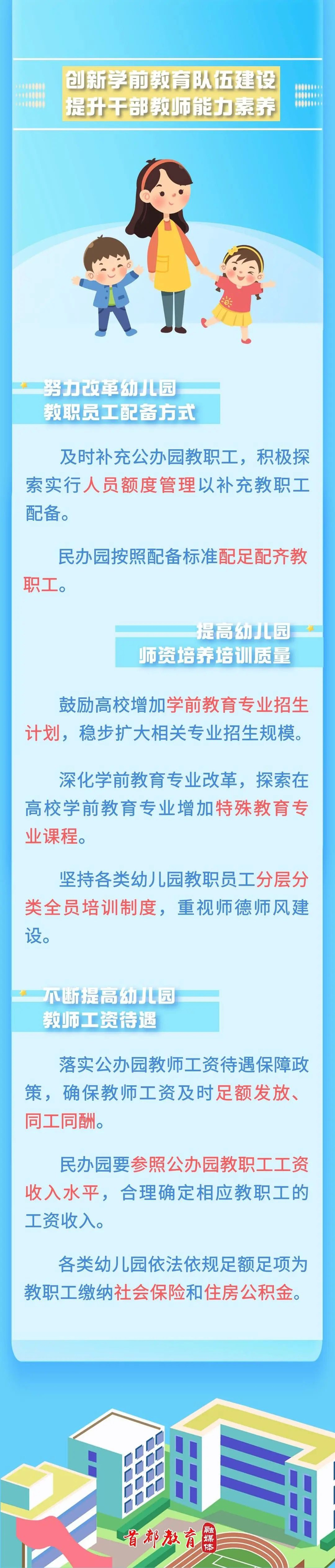 二是提高幼儿园师资培养培训质量。鼓励高校增加学前教育专业招生计划,根据事业发展需要稳步扩大相关专业招生规模,保障教师、保健医等专业人才供给。深化学前教育专业改革,完善培养方案,探索在高校学前教育专业增加特殊教育专业课程,提高师范生的融合教育能力。坚持各类幼儿园教职员工分层分类全员培训制度,突出实践导向,提高培训实效。重视师德师风建设,不断提高教职员工职业道德素养。