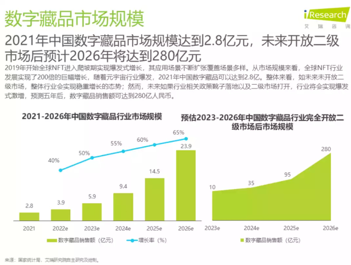 9 月 22 日,艾瑞咨询发布《2022 年中国数字藏品行业研究报告》,报告显示中国数字藏品市场规模 2021 年达到 2.8 亿元,绝大部分生成在联盟链上,少数平台架构在公链上。