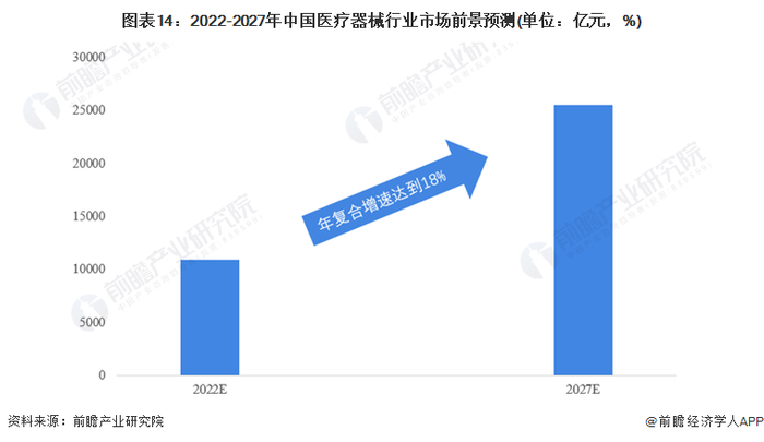 基于此,前瞻估测2027年中国医疗器械行业市场规模或将超过2.5万亿元,年复合增速达到18%。