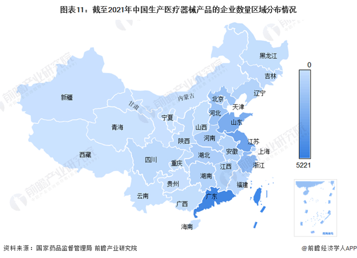根据国家药品监督管理局的数据显示,截至2021年我国生产医疗器械产品的企业数量有28954家;主要分布在广东、江苏、山东、浙江、河北、湖北、上海、江西、安徽、河南等地。其中,广东共有5221家企业,江苏共有3580家。