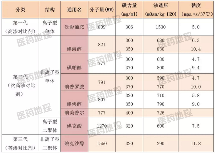 根据渗透压不同,碘造影剂分为第一代高渗碘造影剂,第二代次高渗碘造影剂和第三代等渗碘造影剂。等渗相对血液渗透压而言,次高渗相对高渗而言,实际次高渗碘造影剂的渗透压仍高于血液渗透压,约为2倍左右,而高渗碘造影剂的渗透压高达血液渗透压的5-7倍。