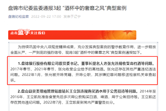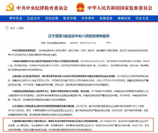 9月22日,中央纪委国家监委网站显示,辽宁通报5起违反中央八项规定精神案例,其中就包括盘锦银行原党委书记、董事长张成杰。