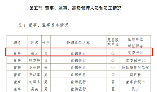 值得关注的是,2019年年报中,代替张成杰成为盘锦银行党委书记一职的正是张允。张允出生于1968年6月,具有硕士研究生学历、经济师职称。不过,彼时张允并未获得董事长任职,披露职务为董事。