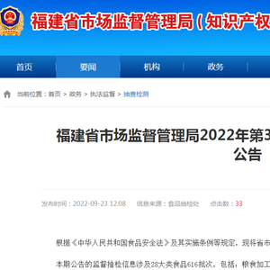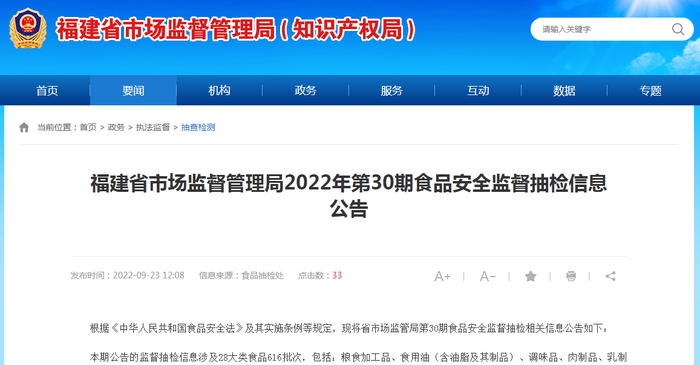 中国质量新闻网讯 2022年9月23日,福建省市场监督管理局网站发布2022年第30期食品安全监督抽检信息公告。本期监督抽检信息涉及28大类食品616批次,其中抽检糕点63批次,合格62批次、不合格1批次。