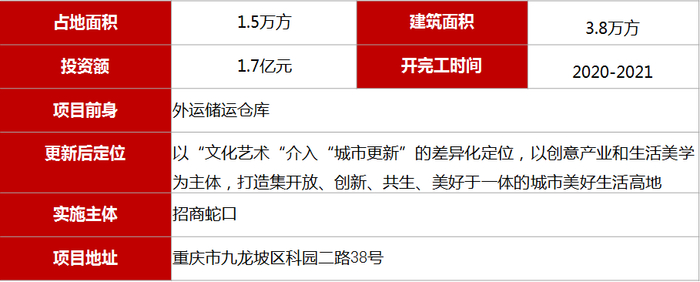 早在2015年,招商蛇口便与重庆两江新区携手打造了金山意库,通过对工业遗存进行改造,打造出了重庆具有引领性的文化创意产业园区。金山意库成功建设及运营,证明了招商意库模式在重庆的适用性。为此,2019年重庆市九龙坡区政府重点引进了九龙意库。项目以完善城市功能,优化产业结构,提升都市形象为核心目标,进入成熟期后,预计累计引进上下游企业突破100家,提供就业岗位1000个,实现年度产值超过5亿,为区域经济发展注入新动力。