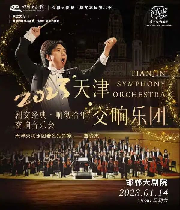 天津交响乐团始建于1985年,经过30多年坚持不懈的追求和努力,被公认为是中国优秀职业交响乐团之一。经过30余年辛勤耕耘,天津交响乐团在演出西方经典交响作品,中国交响作品,歌剧音乐演奏,独奏、重奏等方面积累了丰厚的作品。2023年1月14日,将在邯郸大剧院震撼演出。