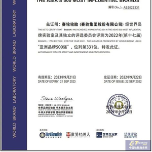 9月22日,由世界品牌实验室(World Brand Lab)主办的“亚洲品牌大会”在上海召开。会上发布了2022年《亚洲品牌500强》排行榜,这是世界品牌实验室第十七次对亚洲品牌的影响力进行的测评。赛轮轮胎以685.68亿元品牌价值上榜2022年(第十七届)“亚洲品牌500强”榜单,位列第331位,较去年跃升4位,彰显了强大的品牌影响力。